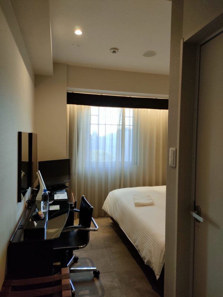 リッチモンドから近いけど、ここはラブホテルに囲まれてるのね。でも渡辺通り、西通りに近くて悪くない。部屋も落ち着いたトーンでキレイ。エアコンビルトイン、TVもバカでかくない。匂いも大丈夫。