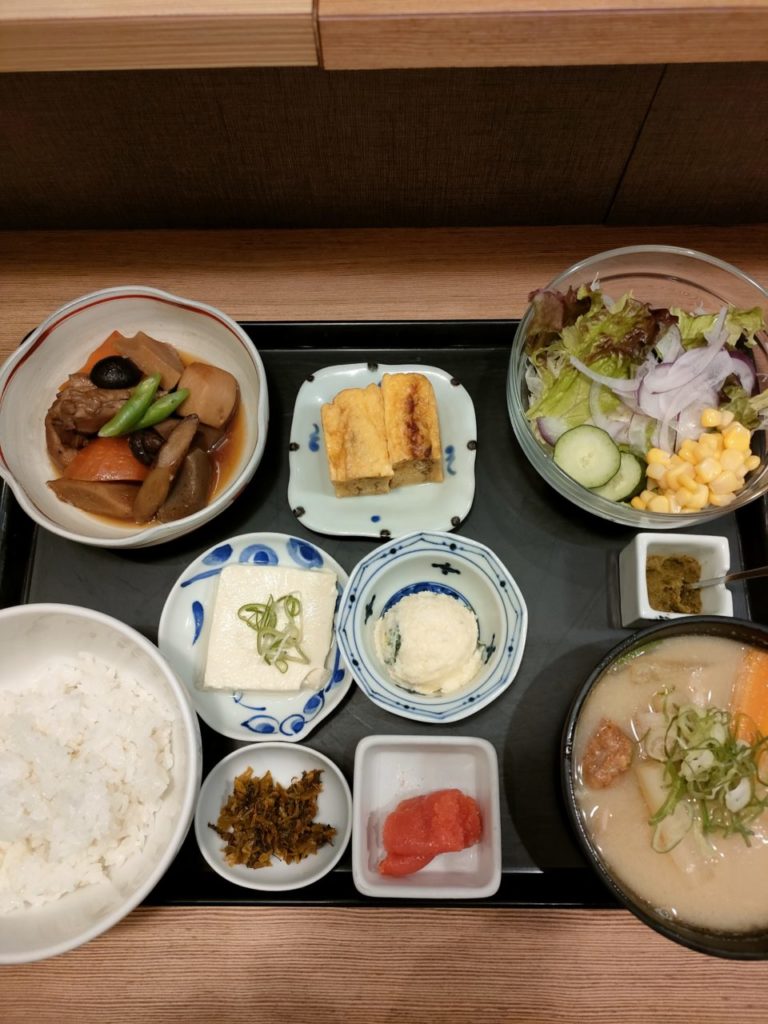 昨晩とんかつ、今日ランチ牛カツ、さすがにこってりしたものは、ということで、近くにあった天神わっぱという定食屋に行った。豚汁にがめ煮。九州は味濃いめかな。甘味も塩分も。