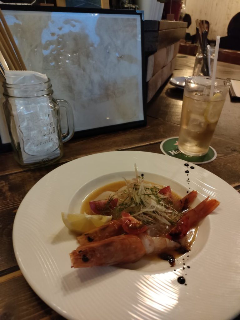 いつも通りがかると女性客でいっぱいなのも納得。前菜盛り、ホタテのエビのカルパッチョ、サラダ、ひき肉のグラタンと、ビストロ三昧。おあじも女性が好みな、甘さもうまくミックスし、盛り付けも美しい。