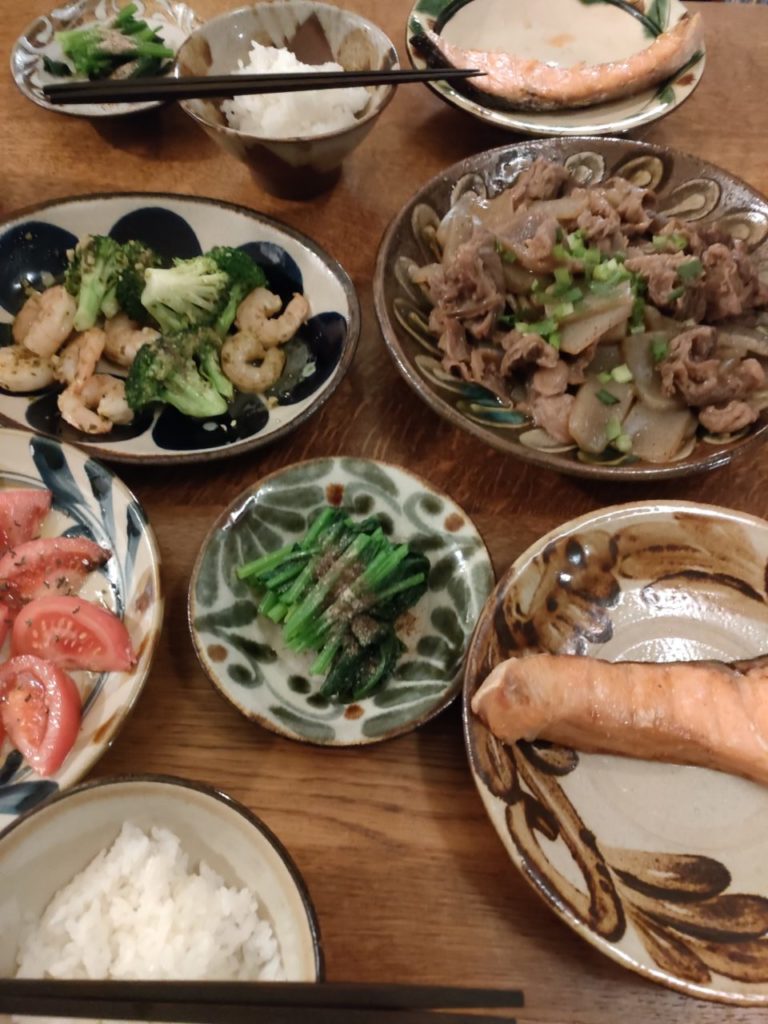 お家の人もご機嫌で、今日の夕飯もその影響力を感じた。エビとブロッコリーのバジル炒め。そしてこちらが作った牛スジとこんにゃくのニンニク醤油炒め。大ぶり鮭の塩焼きもあり、大満足。
