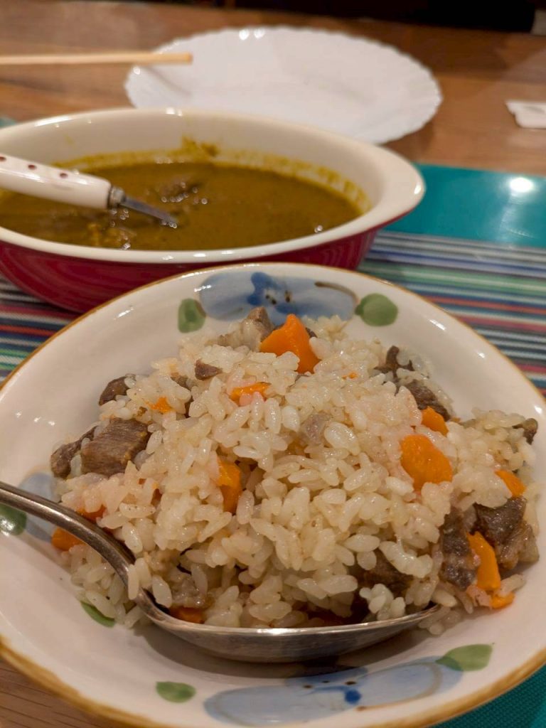 カレーは別でピラフのようなポロと、何だか特別にあった大きい餃子、春雨の炒めもの、肉団子、と安定のおいしさ、そして全て肉がラムだった。こんなにラムが食べられるシルクロード料理の店はそうそうないだろうし、おそらく横浜、東京まで入れても数えるほどではないかと。