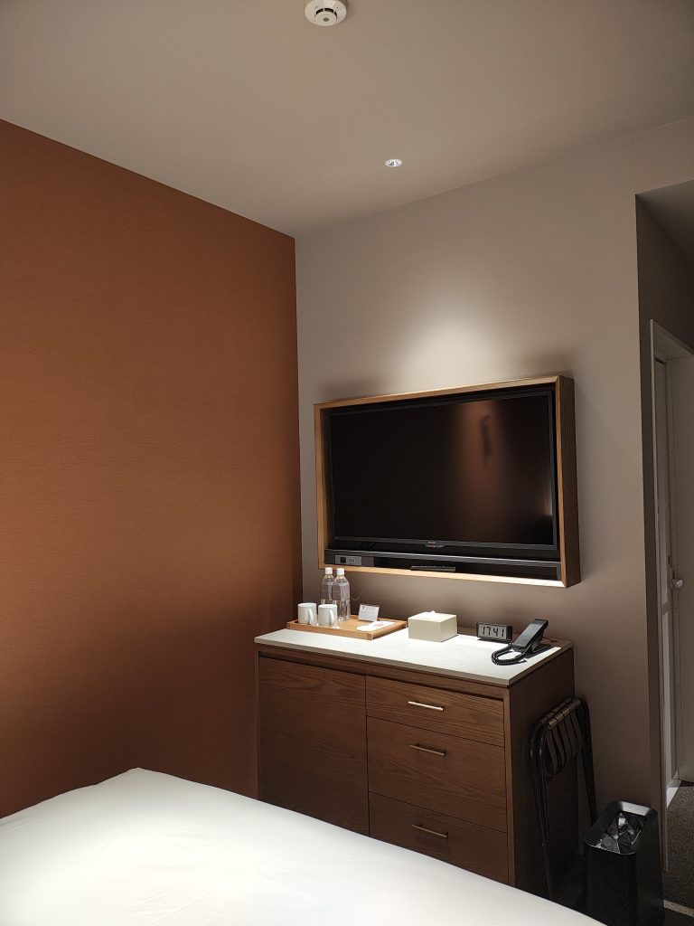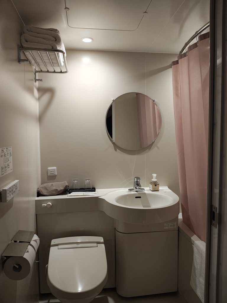 お宿の中は安定のおしゃれなオープンな感じだが、部屋のバスルームだけはもう少しがんばって欲しかった。おそらくコンフォートホテルに付いているものと同じ、シンプルでそんなに広くはないが浴槽がまあまあ深いタイプだが、洗面部分のアメニティーを置くような棚がなく、タオル掛けもないので今ひとつ整理ができない。