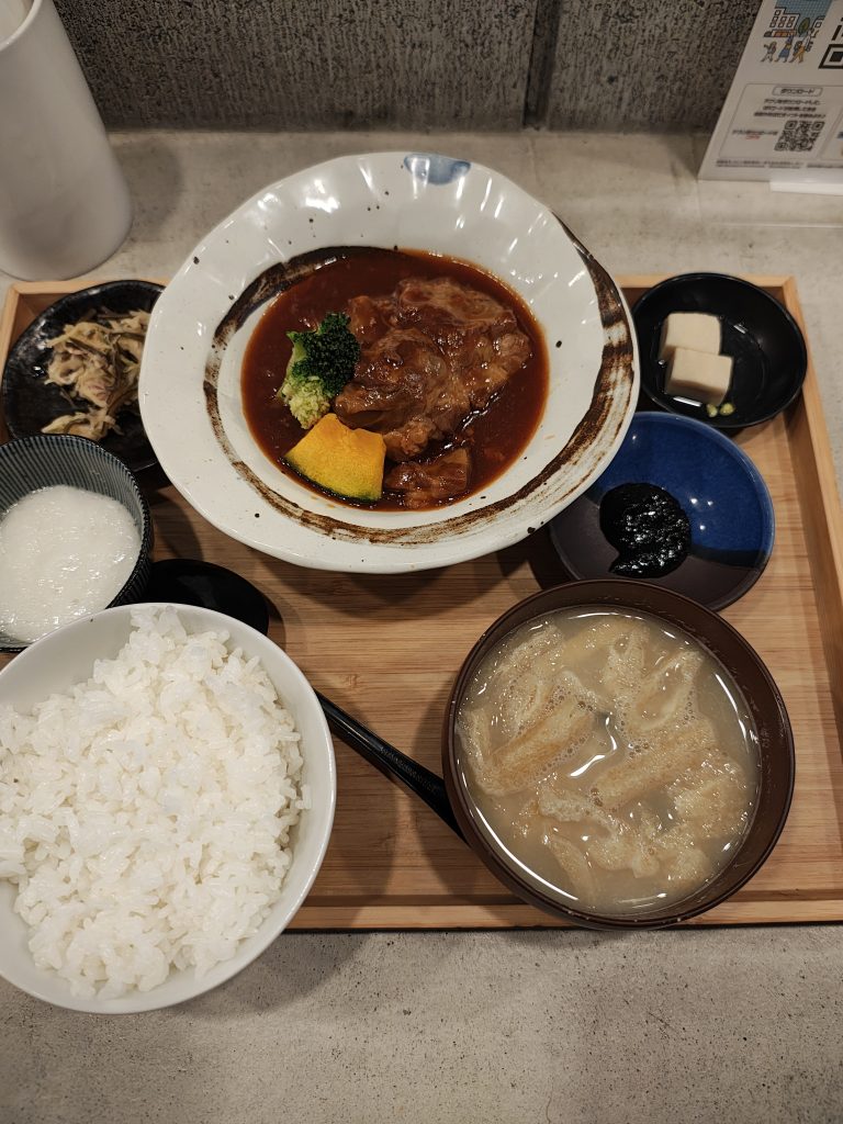 夕飯は近くのカドの食堂。ここは裏路地の先を抜けた所にあり少し拓けたカドの2階にある。定食が充実しており、日本酒もけっこう揃ってそう。今日は豚軟骨のシチューにしてみる。なかなかおいしかったが、軟骨はしょうゆフレーバーの方が好みかなと正直少し思う。