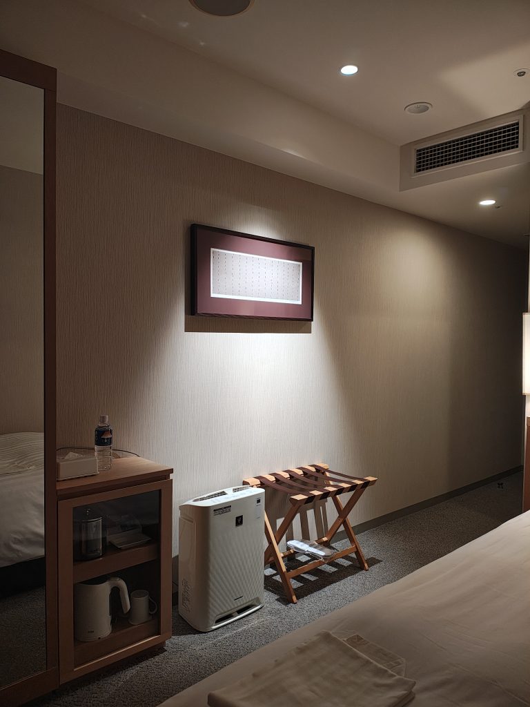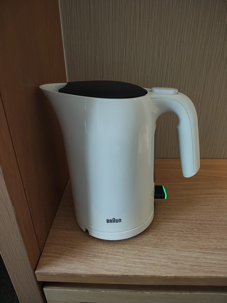 部屋にズボンプレッサーはあってもアイロンは初めてかも。電気ケトルもブラウン製のお初にお目にかかるタイプ。