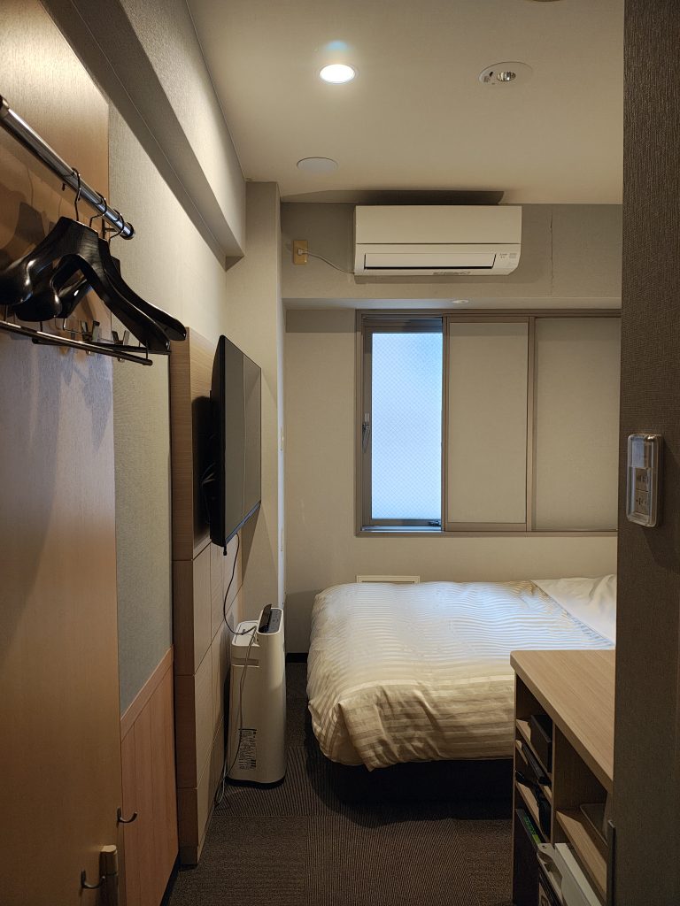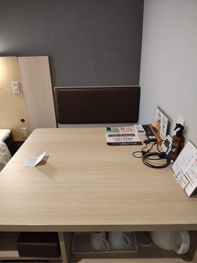 お部屋の中はスーパーホテルの標準的な大きな作り付けのベンチと机があるお部屋。東岸和田のルートインもこんなお部屋だった。まだ新しい方でキレイ。それでも昨日までのリーガロイヤルプレースと壁紙や設えを比べてしまうが、やはり質感的にリーガロイヤルの方が落ち着ける。それでも、前回薩摩川内のスーパーホテルに泊まったことにも触れた、手書き長文のお礼付きウエルカムレターは少しうれしいもの。