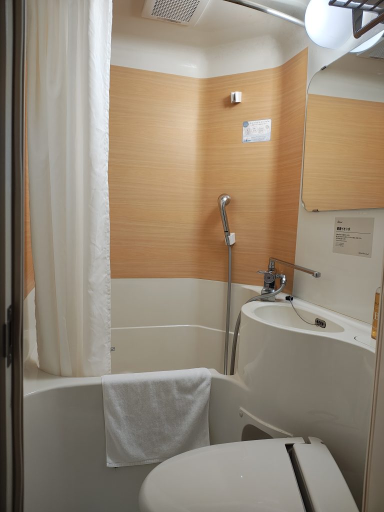 お風呂は本当に小ぶりな部屋の隅が削ってあるタイプ。今回の長丁場の出張も後半に入り少し疲れも溜まってきて、バスタブに湯を張るかシャワーにするか悩ましい。